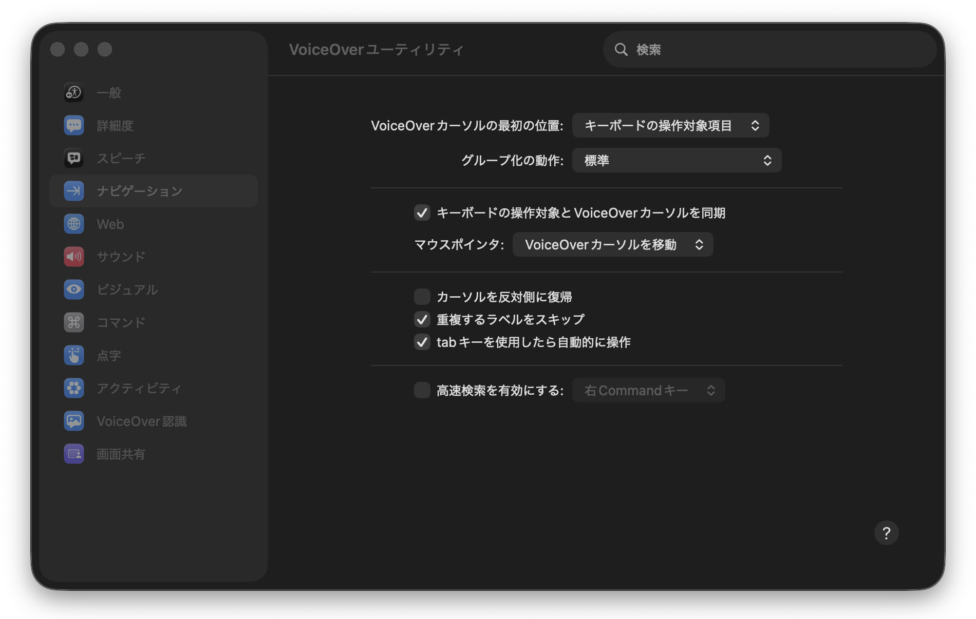 この設定により、マウスポインタの位置にVoiceOverカーソルが移動し、その位置を読み上げるようになります。操作に慣れていない場合は有効にしておくと便利です。