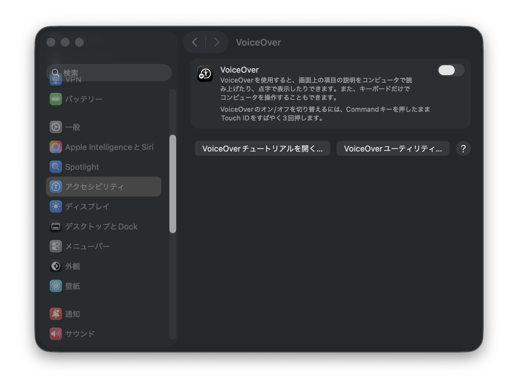 Cmd+F5でVoiceOverを起動Cmdを押しながらTouchIDキーを3回素早く押す- Fnキーがない場合は