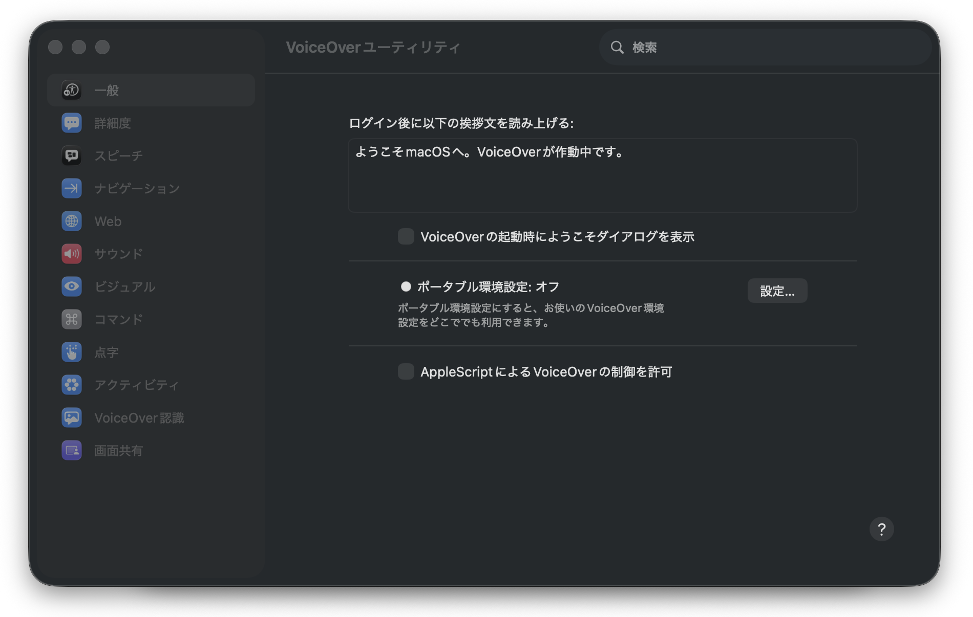 - 一般 >「VoiceOverの起動時にようこそダイアログを表示」のチェックを外す