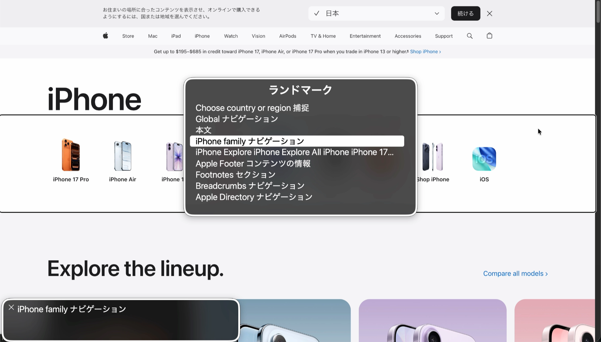 ページ構造(ランドマーク・見出し・リンクなど)を一覧化し、目的の項目へ素早く移動できる機能です。